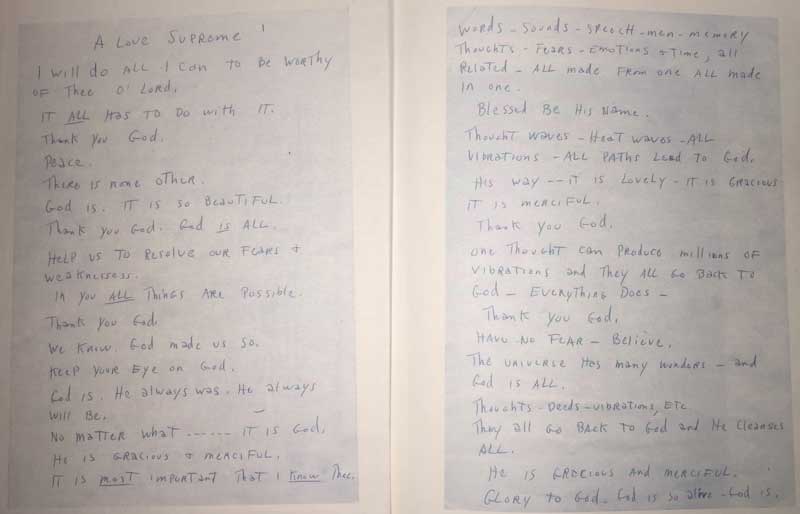 The practice space upstairs provided John with a tranquil environment for “pondering the music he heard within himself” as his wife Alice recalled. She described John coming downstairs after days of intense work on the composition as being “like Moses coming down from the mountain, it was so beautiful. He walked down and there was that joy, that peace in his face.” He recorded A Love Supreme on December 9th 1964 with pianist McCoy Tyner, bassist Jimmy Garrison, and drummer Elvin Jones at Van Gelder Studio in Englewood, New Jersey. The album is recognized as one of the greatest achievements in jazz history.